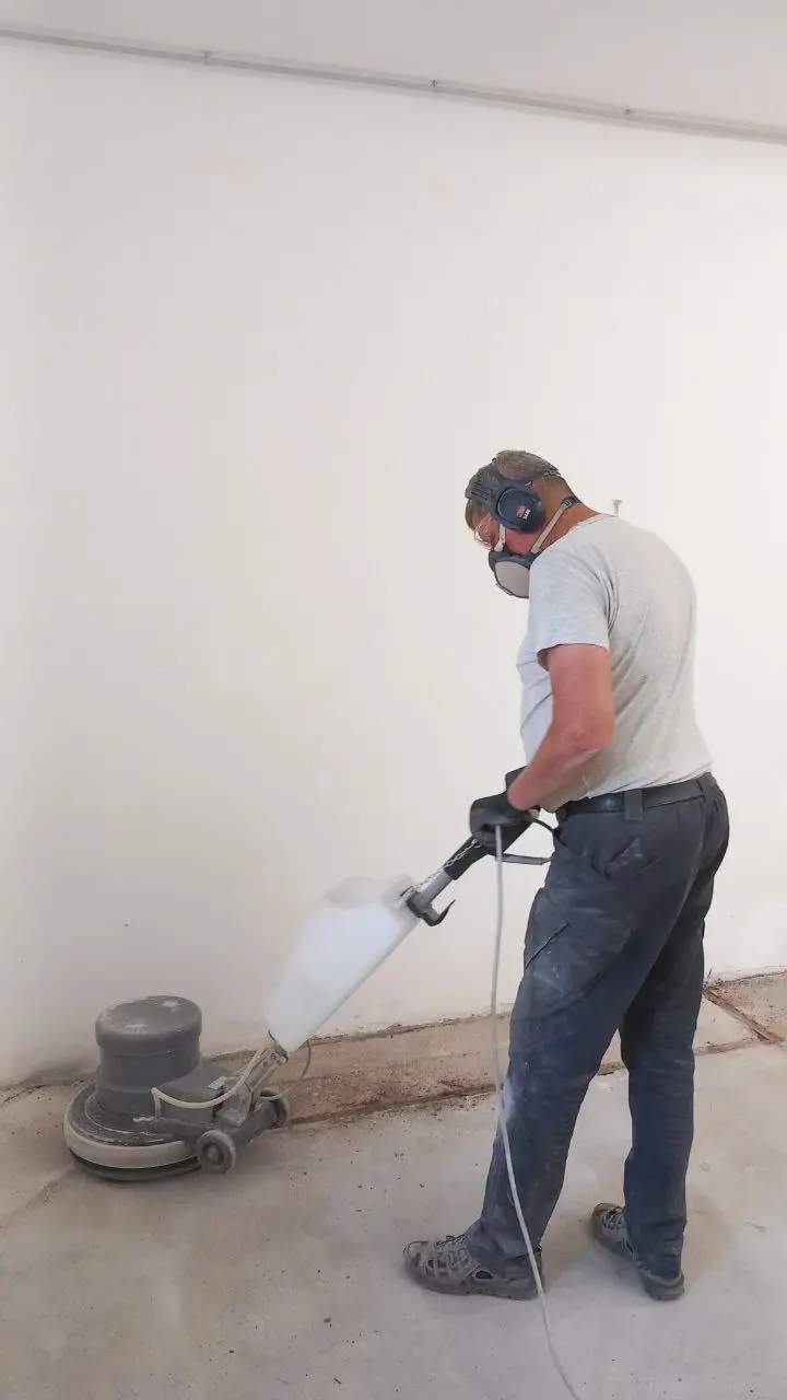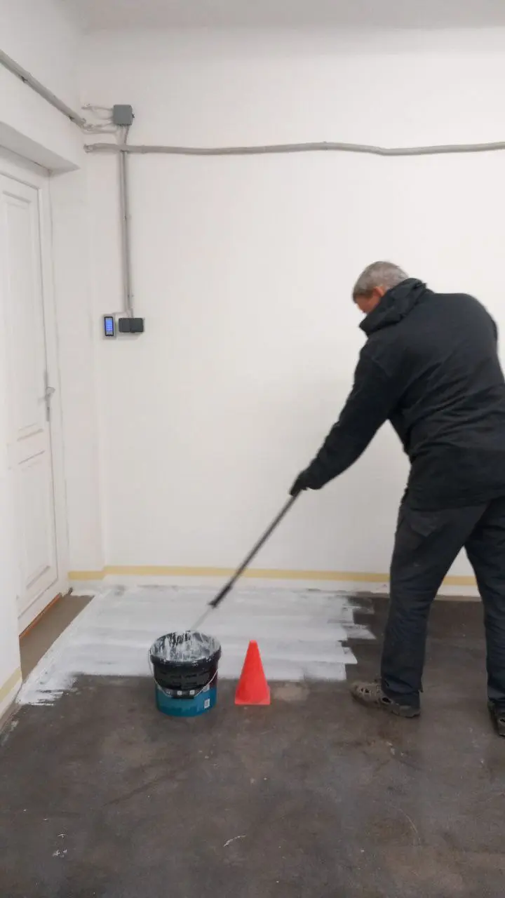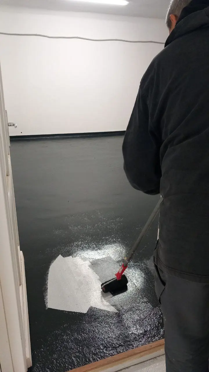A fotókon a Thököly úton egy 30+ éves, rossz minőségű betonra készít többrétegű (4 réteg) epoxi bevonatot garázsnak és raktárnak megfelelő, terhelhető és magas kopásállóságú minőségben. Az anyagok akár 35 €/m2 nettó áron is elérhetőek.