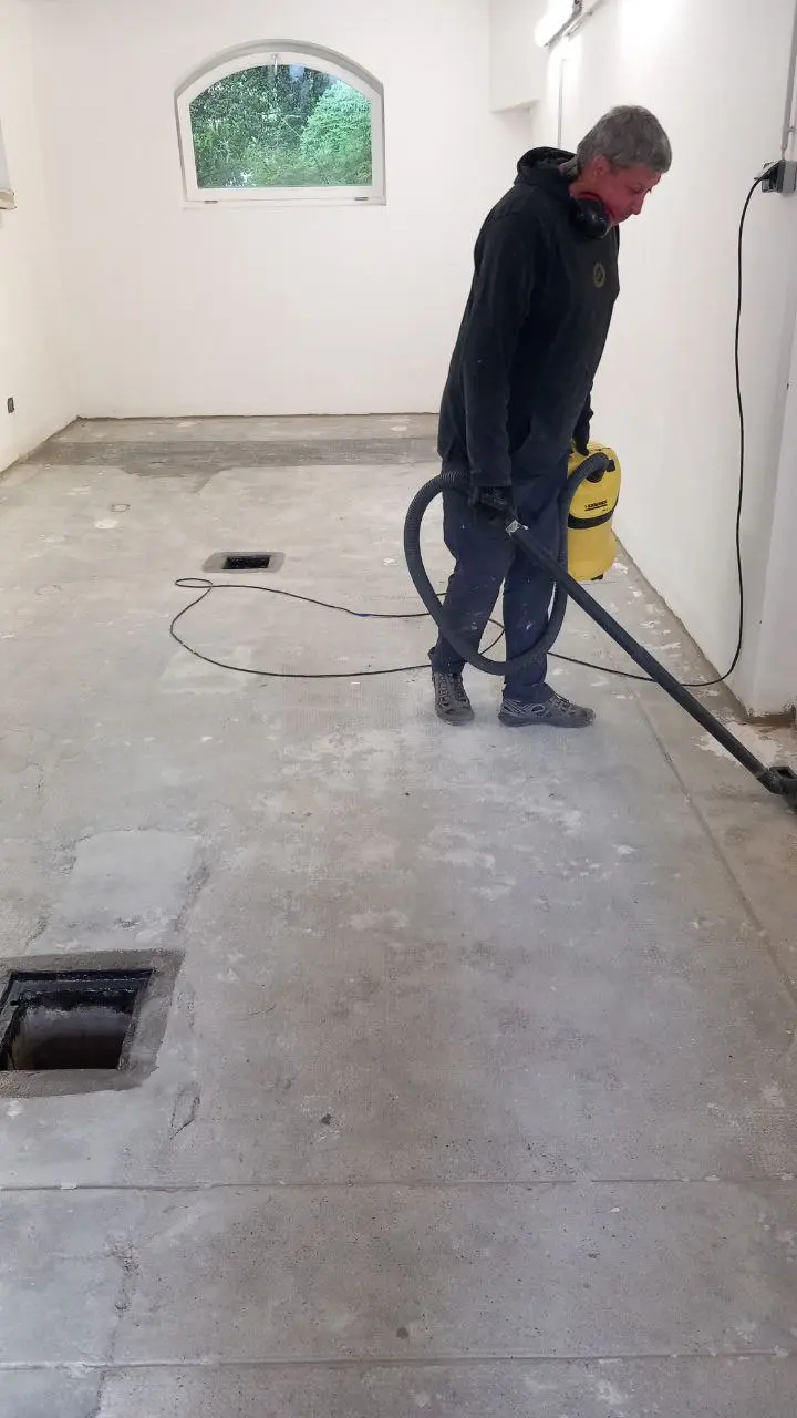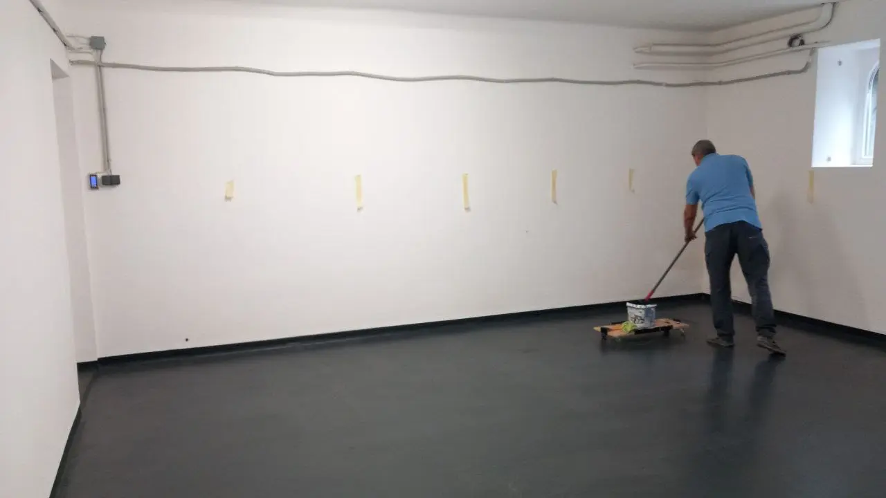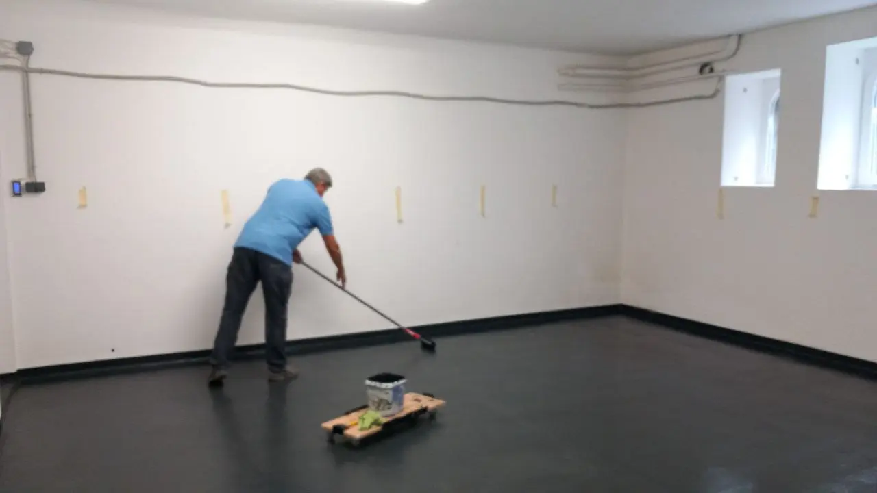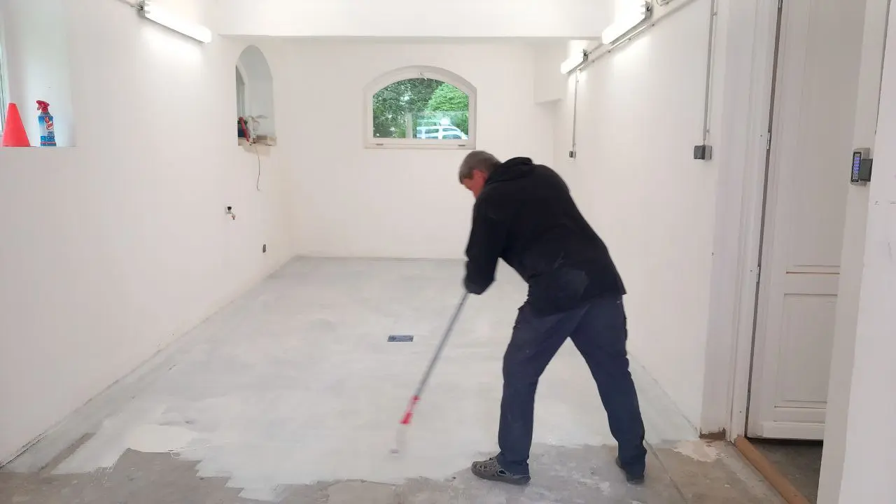 A fotókon a Thököly úton egy 30+ éves, rossz minőségű betonra készít többrétegű (4 réteg) epoxi bevonatot garázsnak és raktárnak megfelelő, terhelhető és magas kopásállóságú minőségben. Az anyagok akár 35 €/m2 nettó áron is elérhetőek.
