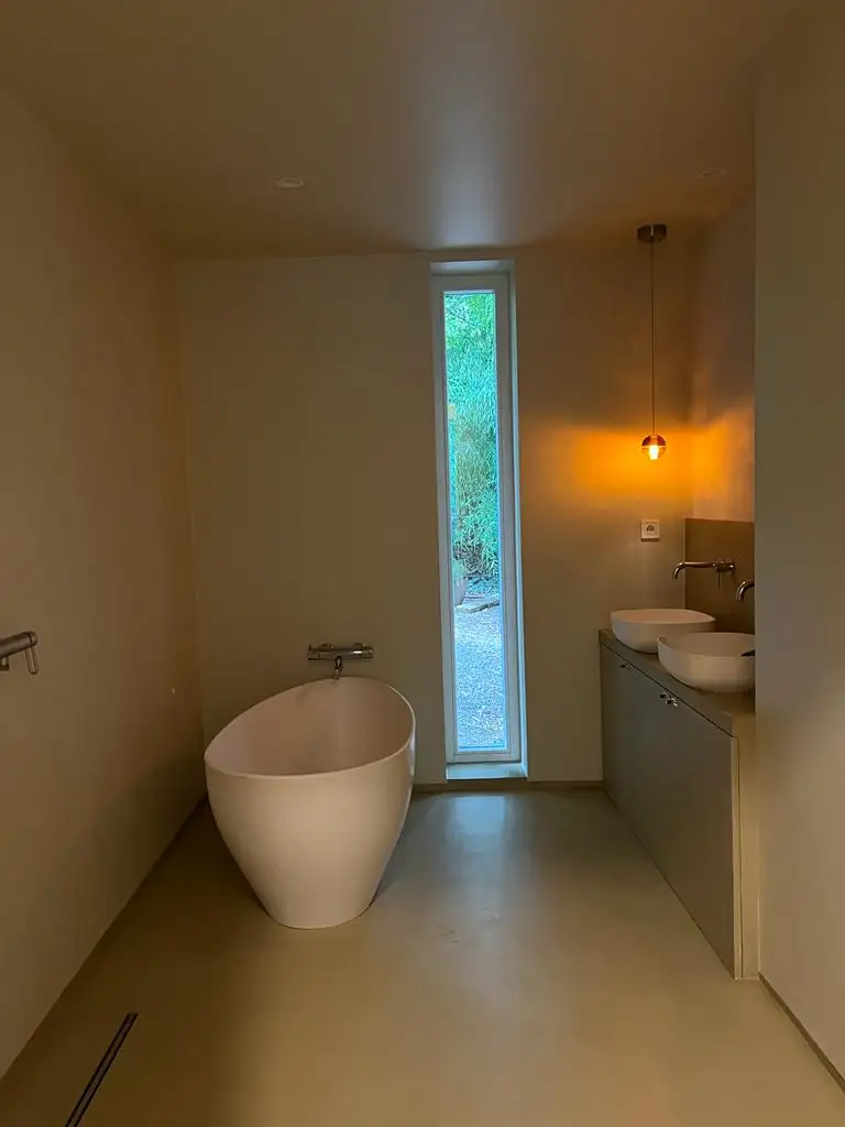 A képeken a nálunk 2020-ban betanult Sz. Ádám műgyantázó mesterünk microcementtel készített szolnoki fürdőszobáját mutatjuk be, fényes poliuretán befejezéssel.